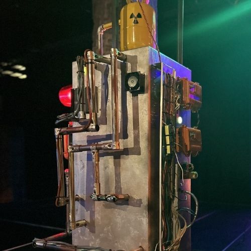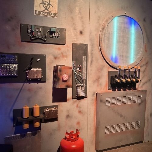 The decor features a futuristic concept with green and blue lights, flashing sirens, lasers, and smoke. Modern metallic structures, including the infamous bomb that only needs the “reactron of enriched uranium” to be operational. Plus, realistic projections create an unforgettable immersive futuristic experience!